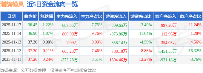 证券之星音讯,到2025年11月17日收盘,瑞鹄模具(002997)报收于36.45元,跌落1.22%,换手率1.16%,成交量2.43万手,成交额8869.06万元。